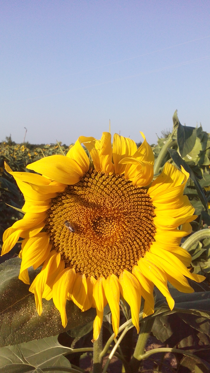 Заснех тази пчеличка в 19,06 ч. на 08.07.2015 г. Може би заради наближаващия залез или заради това, че слънчогледа не е много близо до някой от околните пчелини, не видях други пчели в нивата. Тази нива се намира на около 2 км. от съседното село Балван, община Велико Търново, а до нашия пчелин разстоянието е около 3 - 3.5 км. и едва ли е била от нашите. Колкото и да се вглеждах, не можах да я разпозная :)